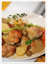 メインは余分な調味料は加えずに、塩とハーブだけでシンプルに仕上げる南仏風煮込み。たっぷりのオリーブオイルでじっくり煮込んだジューシーな鶏肉と、とろけるように柔らかな野菜が絶品です。
