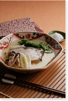 - 鍋に昆布、生姜の薄切り、酒、水と合わせ、弱火にかけ、沸騰したらブリ、大根、ネギ、塩小さじ1/2を入れ、5分煮た後、水菜を加え2~3分煮る。